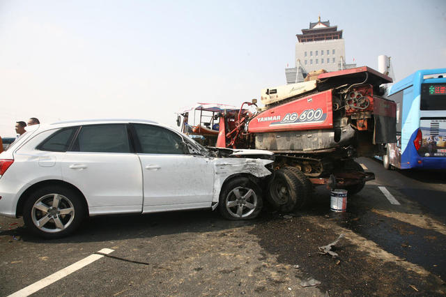 2015年10月9日,江苏扬州,上午9时30分左右,扬州新建成的万福大桥上发生一起**事故,让人啼笑皆非。一名开奥迪轿车的中年女子,可能因为万福大桥较为壮观,边开车边用手机进行自拍,就在走神的一刹那,撞上行驶在前面一辆拉着收割机的平板车,致使平板收割机呈90度横在桥面上。