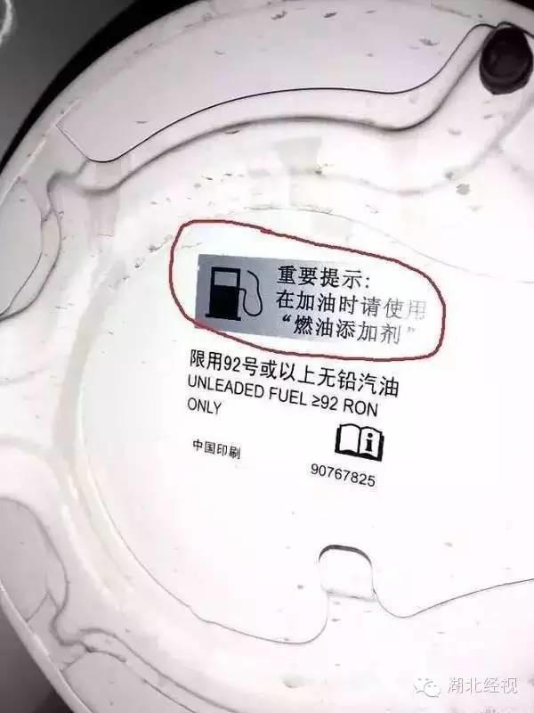 小伙子子指着车上油箱盖说:“大哥你都不看这个的么?车子上面都写了,你这车得使用燃油添加剂。”楼主我凑过去一看,果然在油箱盖上看到上面有个提醒使用燃油宝的标签。于是,车主加完油,又花200块钱买了2瓶燃油添加剂。