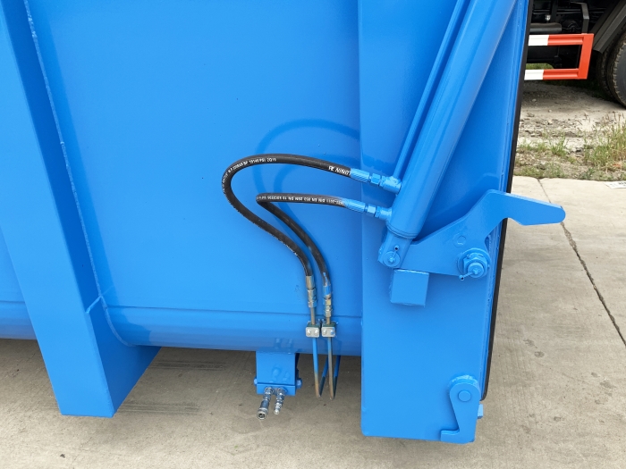 运输介质为:泥污垃圾,液压后门机构密封,箱体顶部为翼展盖,可翻转打开,主要是利用勾臂垃圾车底盘自带的发动机为动力,通过变速箱上安装的取力器,取力器处安装油泵,采用液压机构手动或电控来实现箱体的上钩、下卸、自卸等功能。车辆的箱体采用优质炭钢板全密封焊接结构,具有重量轻、不产生二次污染等优点。